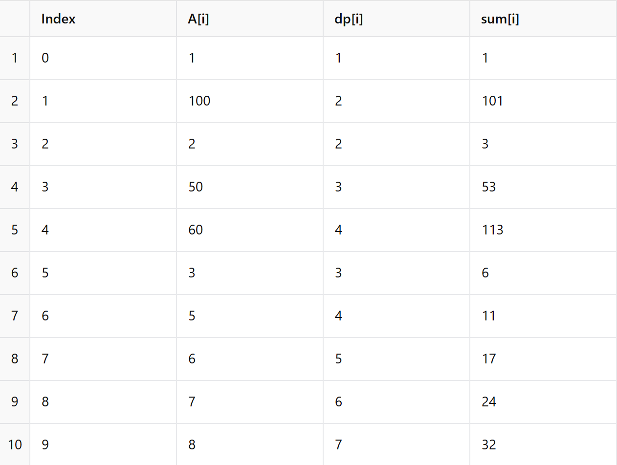 → dp[3] = 2, sum[3] = 50 + 1 = 51 - j = 1 (A[1] = 100), A[3] < A[1] → ❌