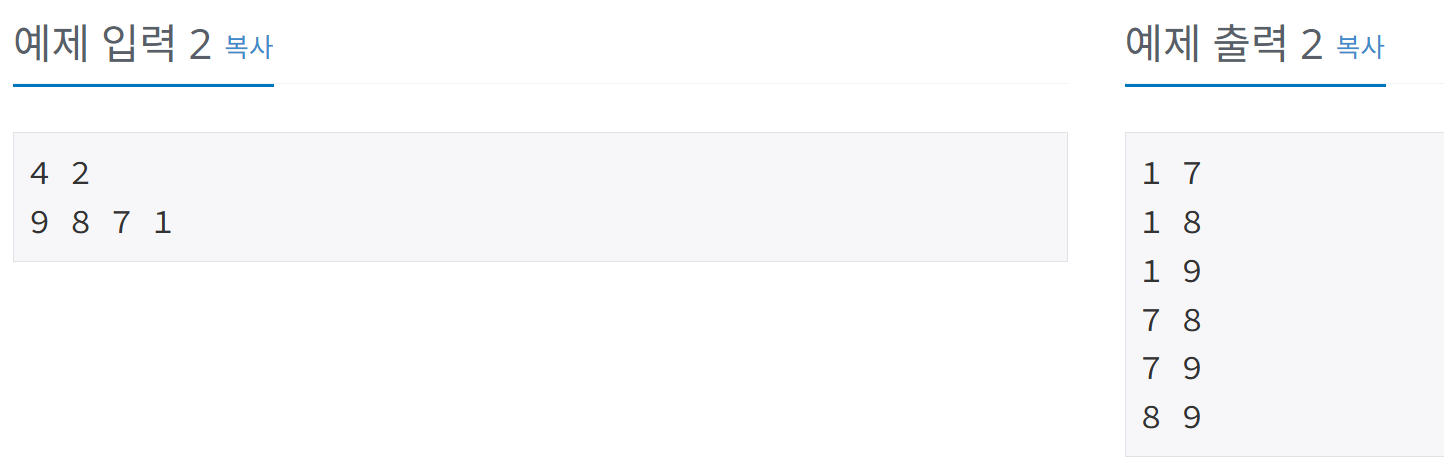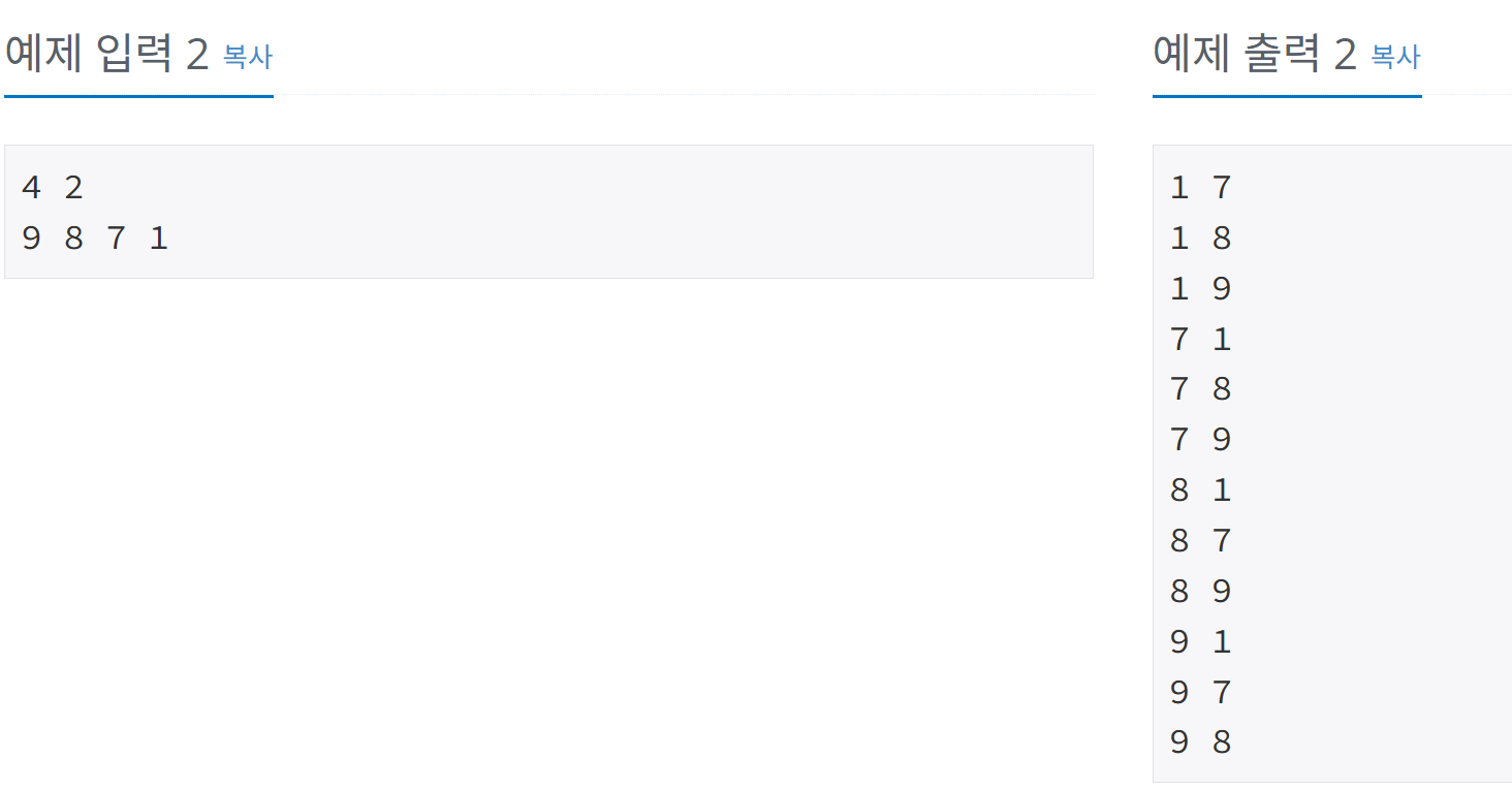 기존 N과 M 문제들은 1~N까지의 수를 기준으로 했으나 이번 문제는 제공되는 숫자들을 뽑아서 진행한다.