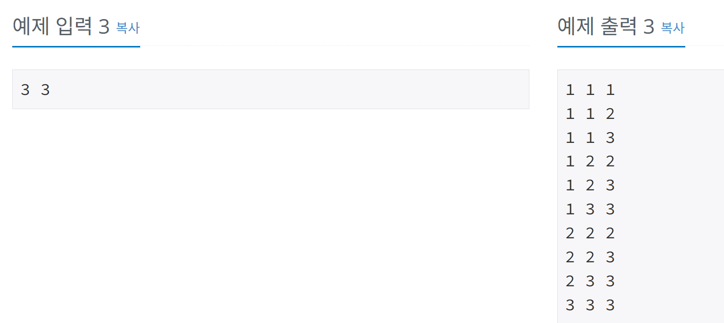 이 문제는 중복을 허용하는 오름차순 배열을 출력하는 문제입니다.